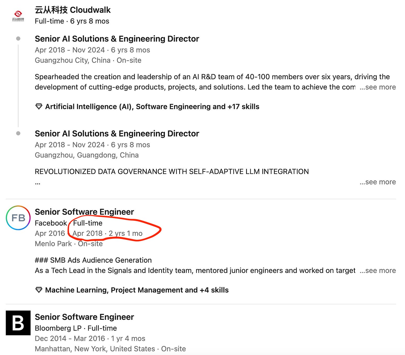 While he’d joined CloudWalk Technology, announced in News in December 2017 [1] (Figure 1), his employment at Facebook only ended in April 2018 (Figure 2), public records appear to show an overlap between the two roles of approximately five months [1].